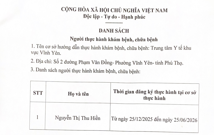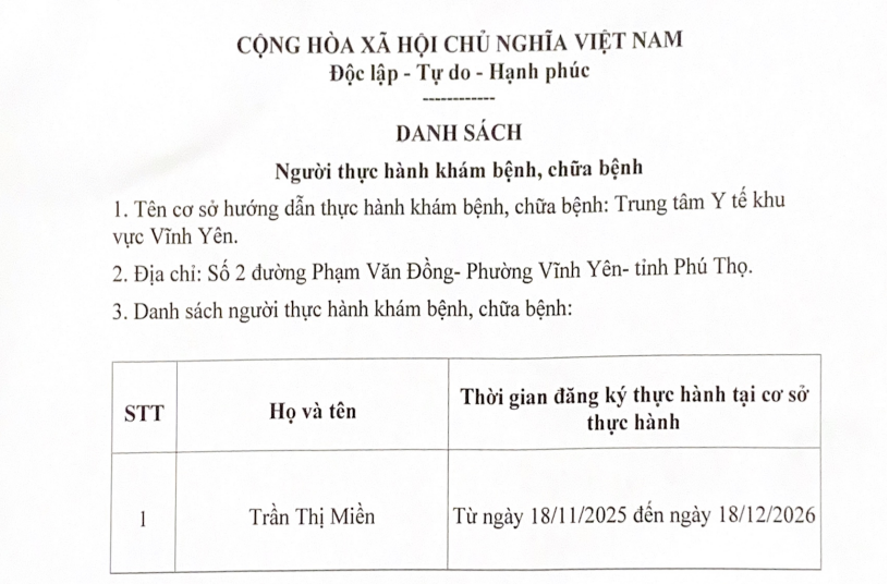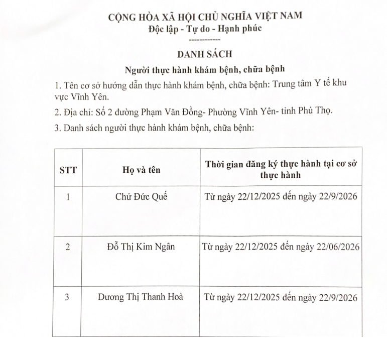 Danh sách Người thực hành khám bệnh, chữa bệnh