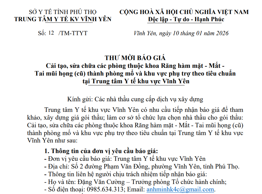THƯ MỜI BÁO GIÁ Cải tạo, sửa chữa các phòng thuộc khoa Răng hàm mặt - Mắt - Tai mũi họng (cũ) thành...