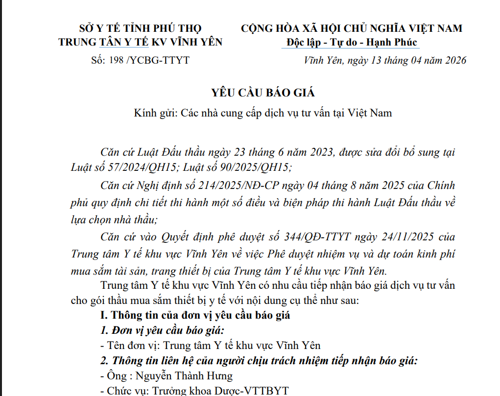 Trung tâm Y tế khu vực Vĩnh Yên có nhu cầu tiếp nhận báo giá để làm cơ sở tổ chức lựa chọn nhà thầu cho gói thầu: Mua sắm máy chủ phục vụ công tác triển khai bệnh án điện tử, chuyển đối số đảm bảo đúng quy định yêu cầu.